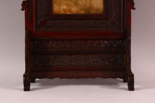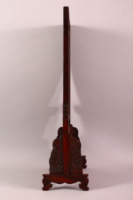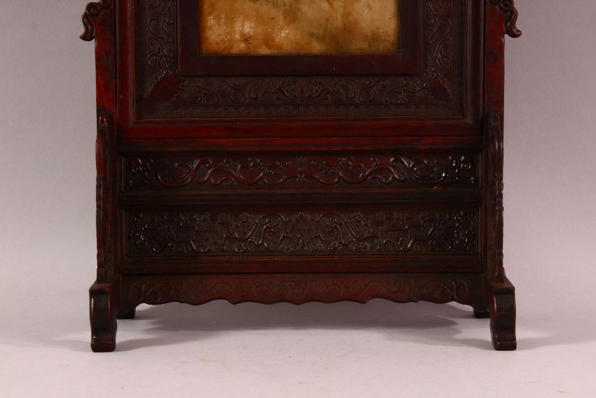 A CHINESE HARDSTONE AND CARVED WOOD TABLE SCREEN, the hardstone panel framed in a carved wooden border on a carved wood stand, with script/mark to soapstone, 52cm high, 29cm wide.