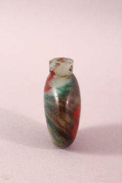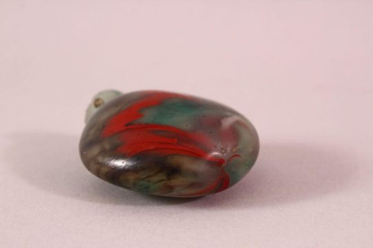 AN EARLY CHINESE MOTTLED GLASS SPHERICAL SHAPED SNUFF BOTTLE, (lacking stopper), 5.5cm high.