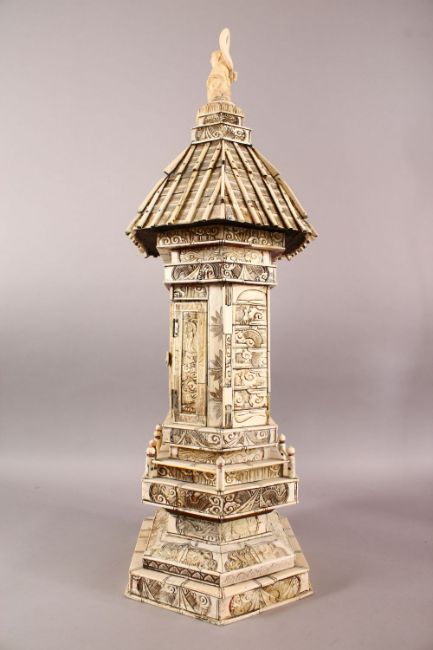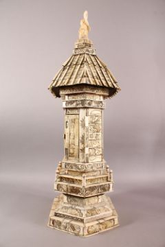 A LARGE JAPANESE MEIJI PERIOD CARVED IVORY & BONE SECTIONAL BUDDHIST SHRINE - SIGNED YUSHU / HIROKATA - the densely carved and incised temple like structure centred by a pair of folding opening doors, opening to reveal a Buddhist triad, The top of the temple shrine with Amida Nyorai, the sections carved with scenes of dragons, clouds, lotus, and arhat's, with a galleried octagonal base, the underside with an inset red seal tablet reading Yushu/ Hirokata. 76.5cm x 33cm