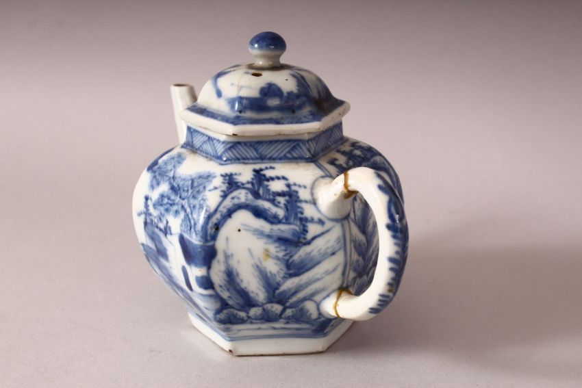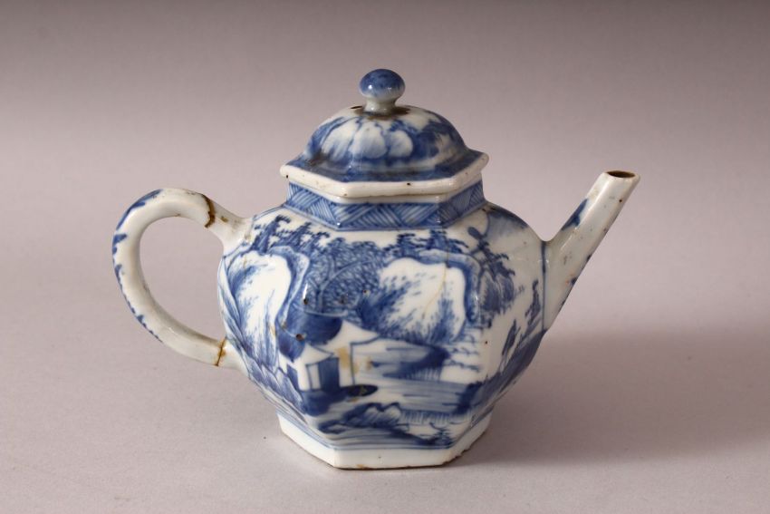 A 18TH / 19TH CENTURY CHINESE BLUE & WHITE PORCELAIN TEAPOT - decorated with native landscape views, 11cm high.