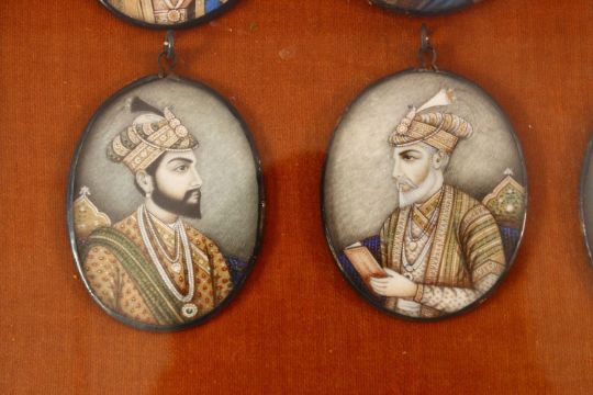 A SET OF 6 MINIATURE PERSIAN PAINTINGS, each depicting a prince or princess, each individually framed within one frame, possibly painted on ivory, 28.5cm x 25cm framed.