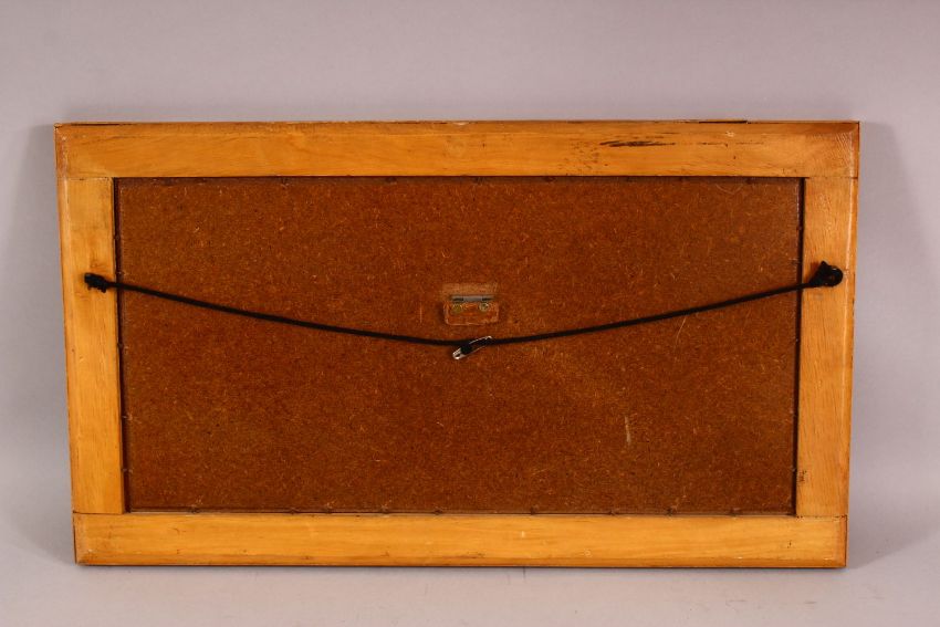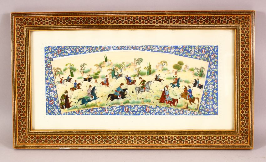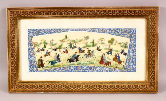 A PERSIAN HAND PAINTED HUNTING SCENE ON BONE SLITHER, contained within a typical micro mosaic frame, 51.5cm x 29.5cm.