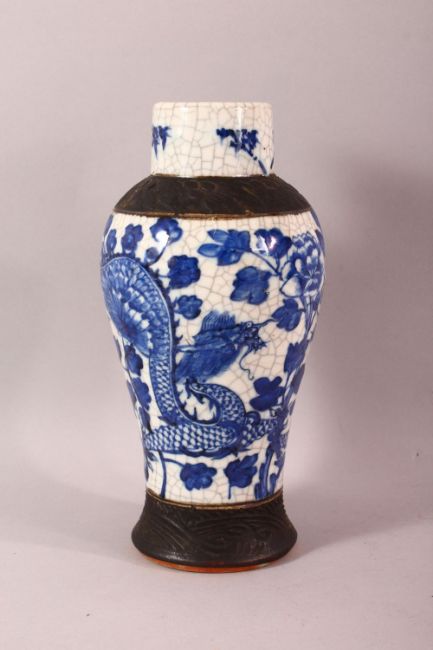 TWO 19TH CENTURY CHINESE BLUE & WHITE PORCELAIN VASES & ONE COVER, the body of the vases decorated with dragons amongst flora, the base with a seal mart, one with a cover, the vases alone 27cm high