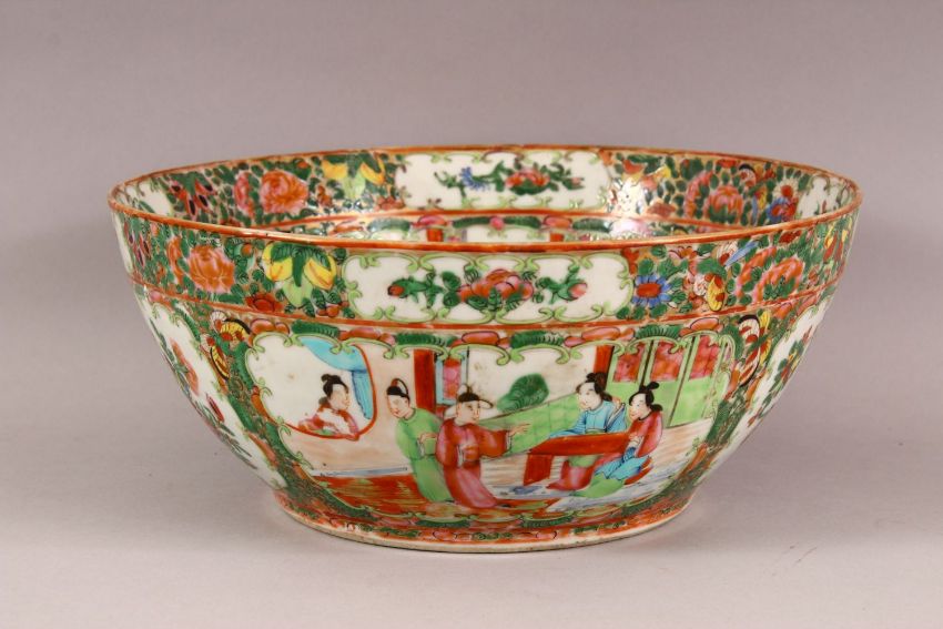 A 19TH CENTURY CHINESE CANTON FAMILLE ROSE PORCELAIN BOWL - with panel decoration of figures, flora, birds and butterflies,29CM