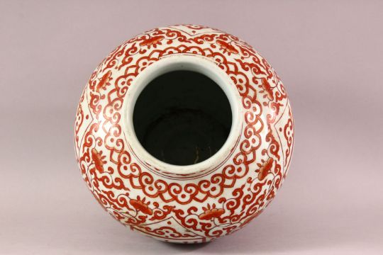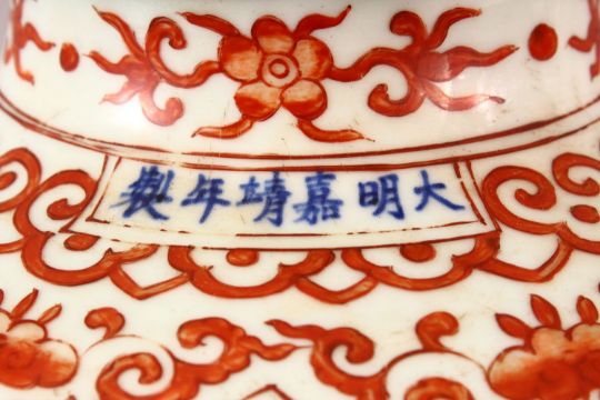 A CHINESE RED AND WHITE VASE FOR THE ISLAMIC MARKET, the body profusely painted with flowers and scrolling vines between panels of calligraphic script, six character blue mark to lower neck, 29cm high.