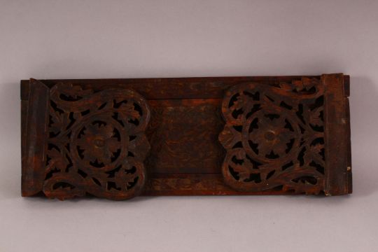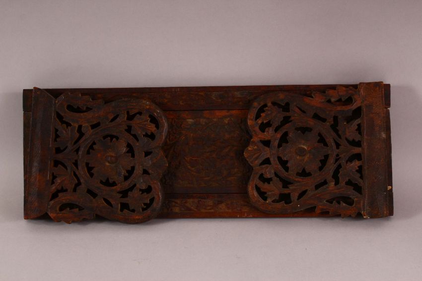A 19TH CENTURY ISLAMIC CARVED WOOD BOOK STAND, with folding end sections carved and pierced with floral motifs, 41cm long.
