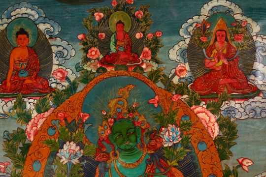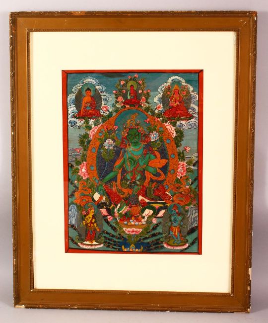 A FRAMED TIBETAN HAND PAINTED THANGKA / PANEL, depicting various deities, framed and glazed, 61cm x 49cm.