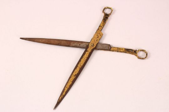 A FINE LARGE 19TH CENTURY TURKISH OTTOMAN GOLD INLAID CALLIGRAPHIC SCISSORS, 27cm long.