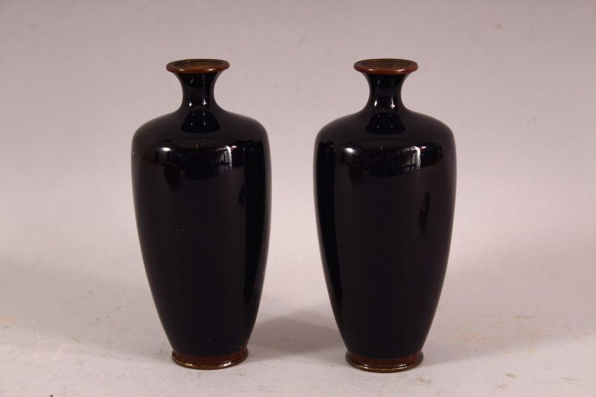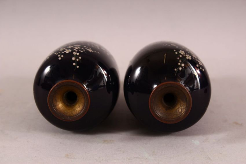 A FINE PAIR OF JAPANESE MEIJI PERIOD CLOISONNE VASES AND STANDS, decorated with birds amongst native flora, in original fitted box, each vase 12cm high.