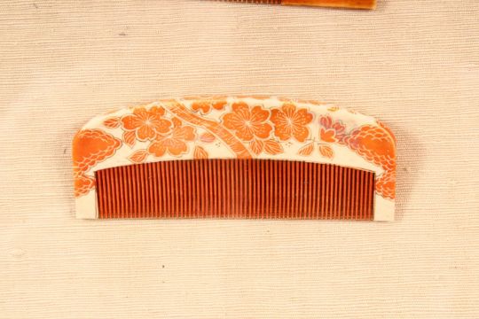 A FRAMED SET OF 19TH CENTURY JAPANESE CARVED & STAINED IVORY COMBS, each with red staining and floral decoration, housed in a meta frame for display, 33cm x 22cm