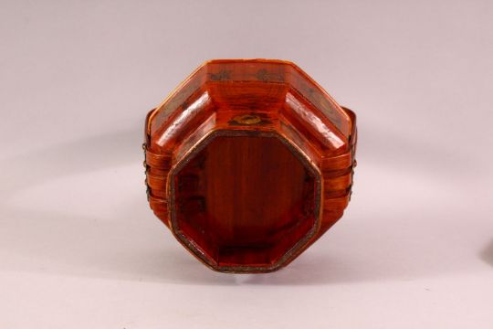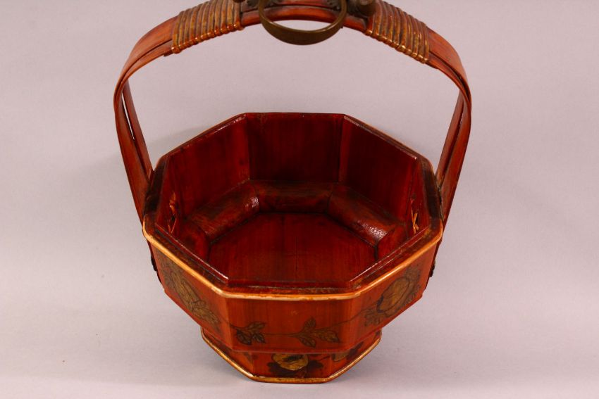 A CHINESE LACQUER LIDDED BASKET & COVER - decorated with scenes of figures amongst flora, with a signature to the sides of handle, 30cm high x 22c m
