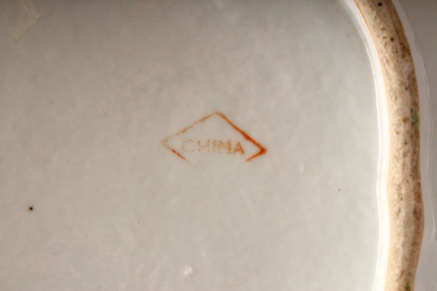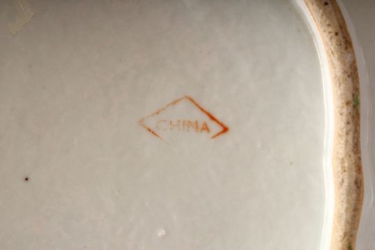 A 19TH CENTURY CHINESE CANTON PORCELAIN MOULDED DISH - decorated with leaf pattern with butterflies and longevity symbols, base with an iron red rummer mark " china" , 26cm