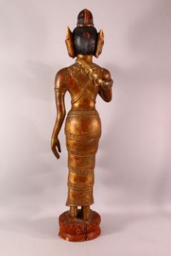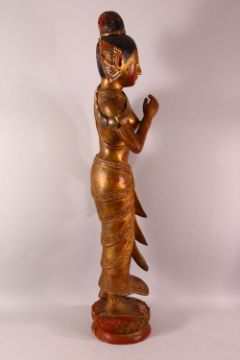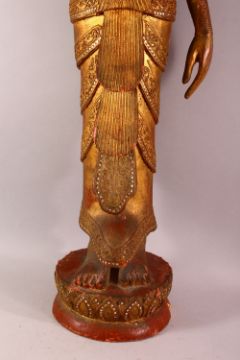A LARGE THAI GILT AND RED LACQUER CARVED WOOD FIGURE, standing on a lotus base, 104cm high.