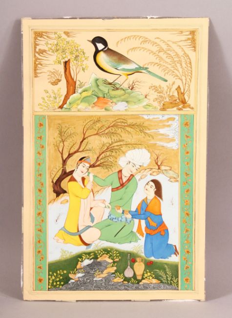 A PERSIAN MINIATURE PAINTING ON PAPER, with gilt decoration depicting a figure with two female attendants in an outdoor setting, the top with a painting of a bird amongst native flora, the borders with gilt decoration, 32.5cm x 21cm.