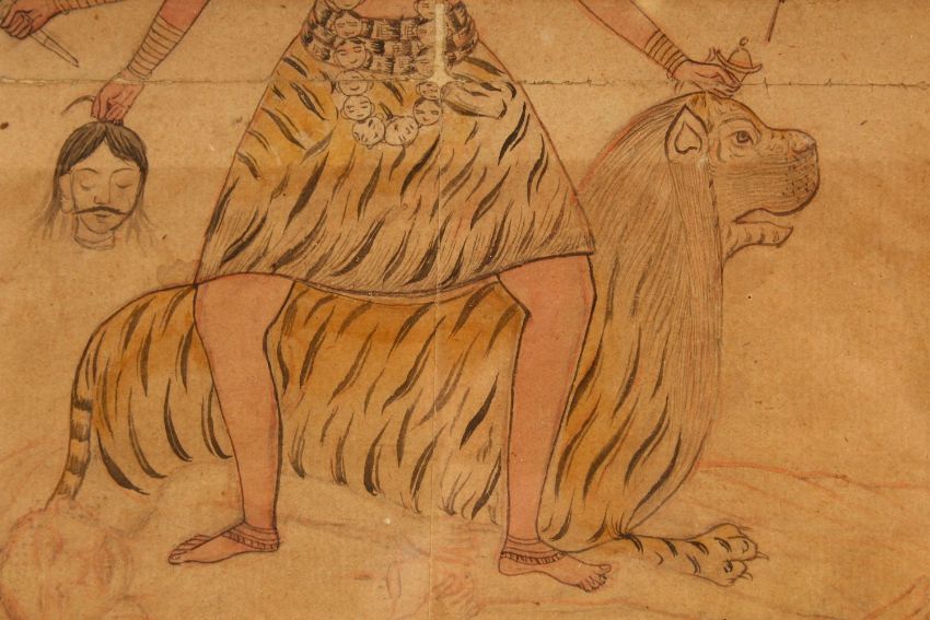 A 19TH CENTURY INDIAN PAINTING ON PAPER OF KALI sat upon a tiger, framed and glazed, 31cm x 25.5cm overall.