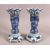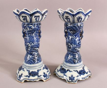 A PAIR OF VERY UNUSUAL SHAPED CHINESE BLUE AND WHITE CANDLE STANDS - FOR THE ISLAMIC MARKET, the petal shape bowls painted with characters to the outer, the stems with wave motifs and the bases with stylised clouds, both with six character mark to base, 26cm high.