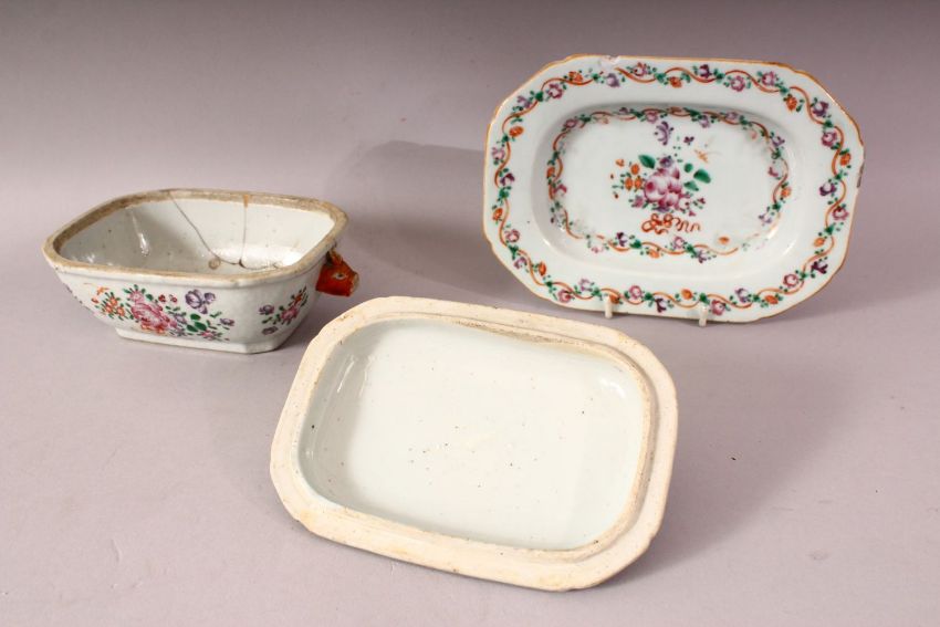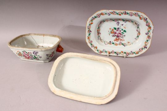 AN 18TH CENTURY CHINESE FAMILLE ROSE PORCELAIN TUREEN, COVER & STAND - the smaller tureen decorated with native scrolling flora with beast handles (AF) 19cm wide x 14cm deep