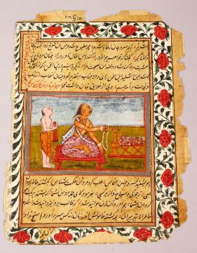 AN INDIAN ILLUMINATED MANUSCRIPT PAGE, painted with a royal figure and attendants, inscription and decorative floral border, the verso also painted with an illustration, inscription and floral border, 25.5cm x 18.5cm.