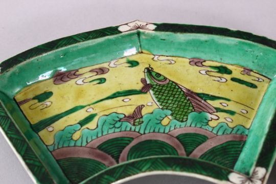 A PAIR OF CHINESE FAMILLE VERTE PORCELAIN FISH DISHES, depicting fish jumping through waves, 20cm wide.