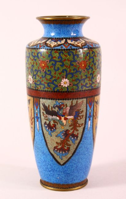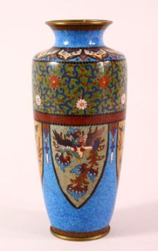 A JAPANESE MEIJI PERIOD CLOISONNE VASE - the vase with a lower blue ground and panels of dragons and pheonix birds, with formal scrolling lotus upon green speckle ground, 18.5cm
