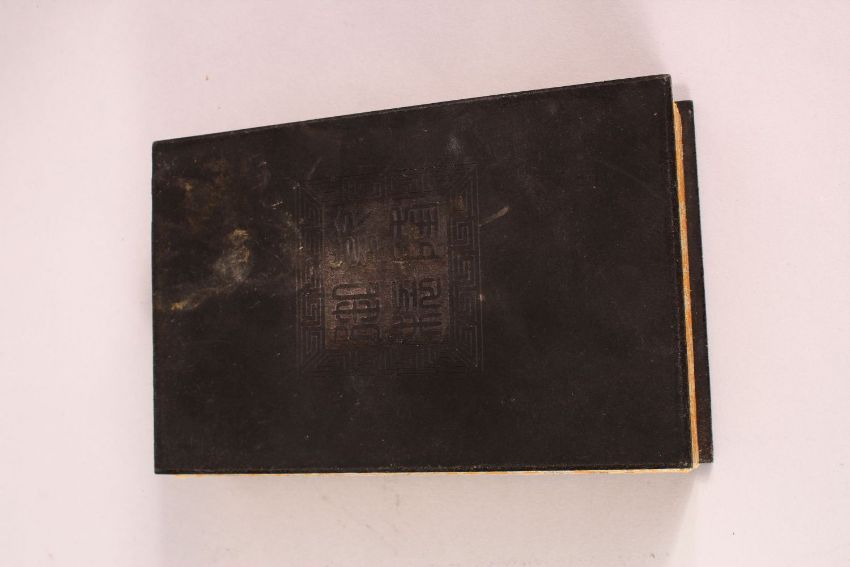 A CHINESE BOOK OF JADE GILT CARVINGS, the pages opening to reveal carved and gilded panels, including seals and calligraphy, 15cm x 23cm