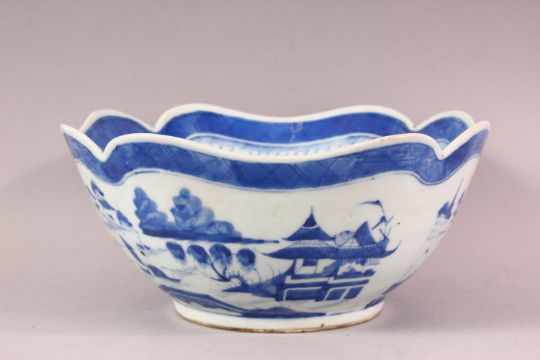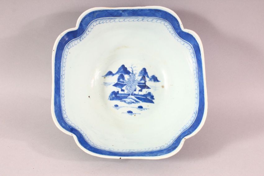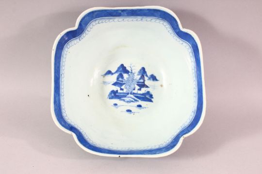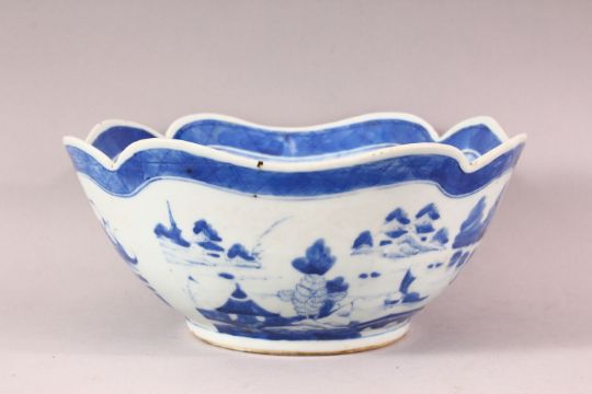 AN 18TH / 19TH CENTURY CHINESE BLUE & WHITE PORCELAIN BOWL, of quatrefoil form, decorated with scenes of native waterside landscapes, 24cm