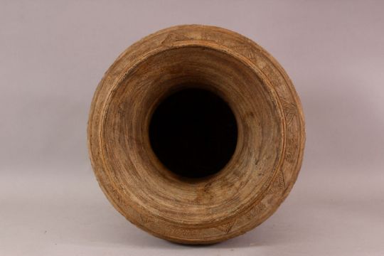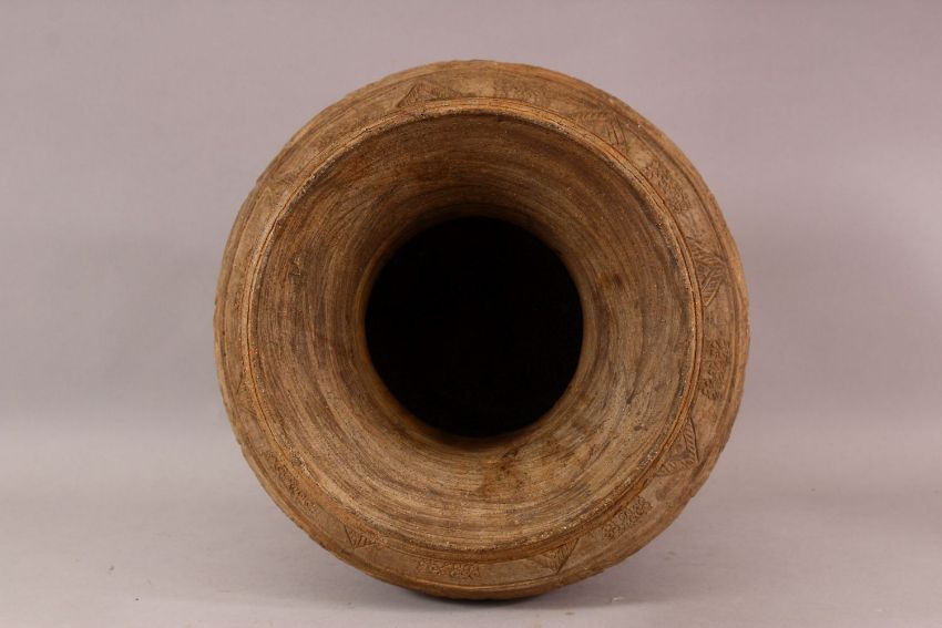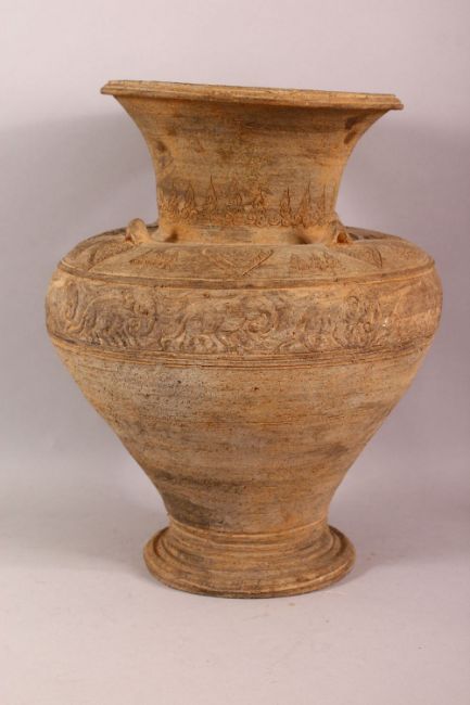 A LARGE EARLY ISLAMIC POTTERY VASE, the body with relief band of elephants, 37cm high.