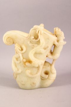 A LARGE CHINESE CARVED JADE LIBATION CUP WITH CHILONG - the libation cup with carved chilong decoration, 20cm