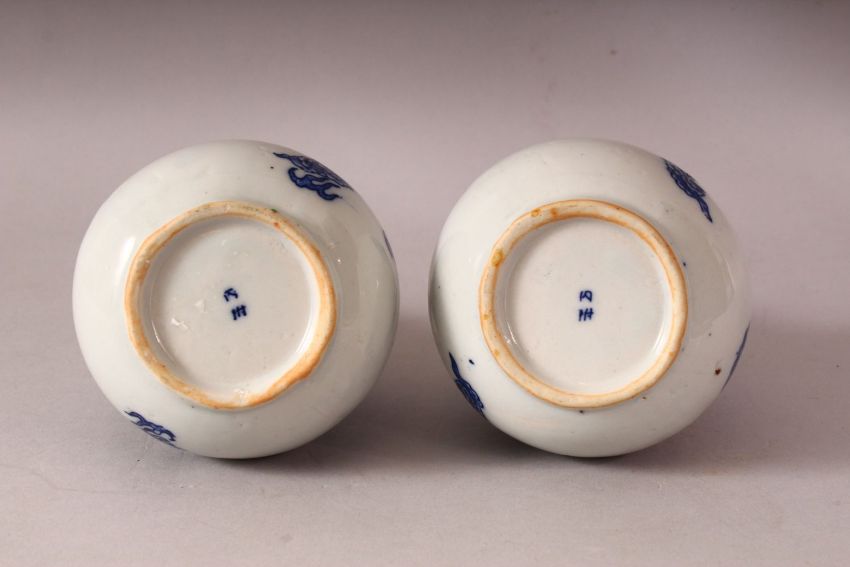 A PAIR OF 19TH / 20TH CENTURY CHINESE BLUE & WHITE PORCELAIN VASES - each decorated with scenes of a dragon amongst clouds, 19cm