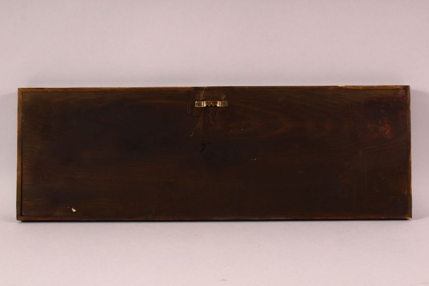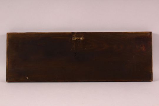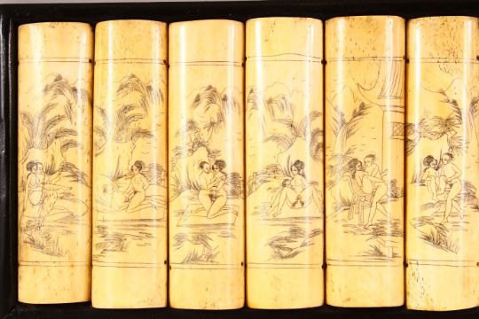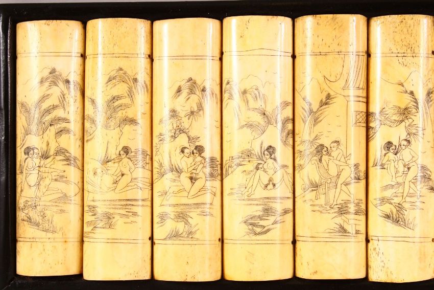 A CHINESE CARVED & STAINED BONE EROTIC PANEL - the panel simulating 12 book ends , each section depicting a varying erotic scene, mounted to a wooden frame, 53cm x 18cm