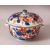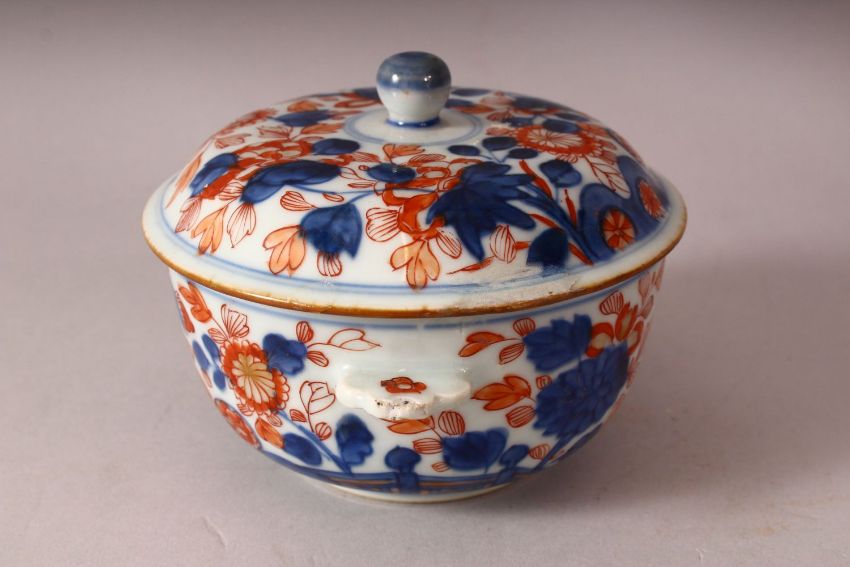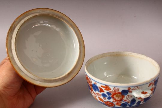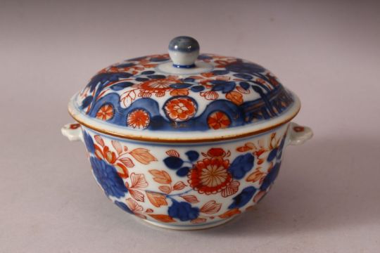A 19TH CENTURY CHINESE PORCLELAIN ECULE & COVER - decorated with typical imari palate depicting flora in underglaze blue & iron red, with twin handles, 15cm diameter