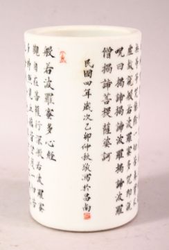A CHINESE FAMILLE ROSE PORCELAIN BRUSH WASH - the body decorated with bands of calligraphy, the base with a four character mark, 13cm
