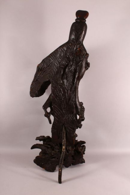 A LARGE 18TH CENTURY CHINESE ROOT WOOD CARVING OF GUANYIN, on a naturalistic root base, 101cm high.