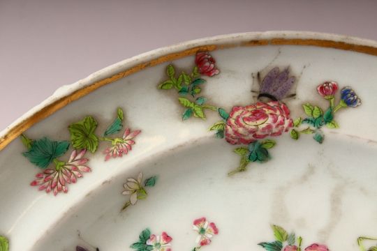 A 19TH CENTURY CHINESE CELADON FAMILLE ROSE PORCELAIN WARMING DISH - The dish decorated with native flora with a central armorial crest, 25.5cm