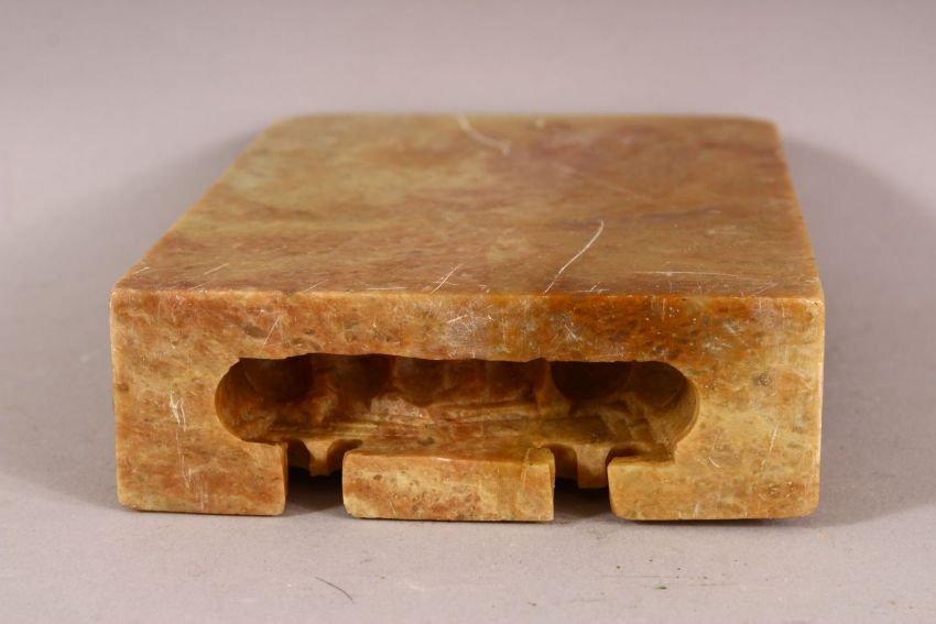 A CHINESE SOAPSTONE CARVING of a planter with flowers, 14.5cm high, 10.5cm wide.
