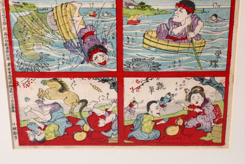 A JAPANESE MEIJI PERIOD WOOD BLOCK PRINT - COMICAL ANIMATION SERIES - depicting a Japanese comic in eight plates, signed and sealed, professionally framed, 61.5cm x 44cm