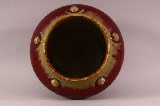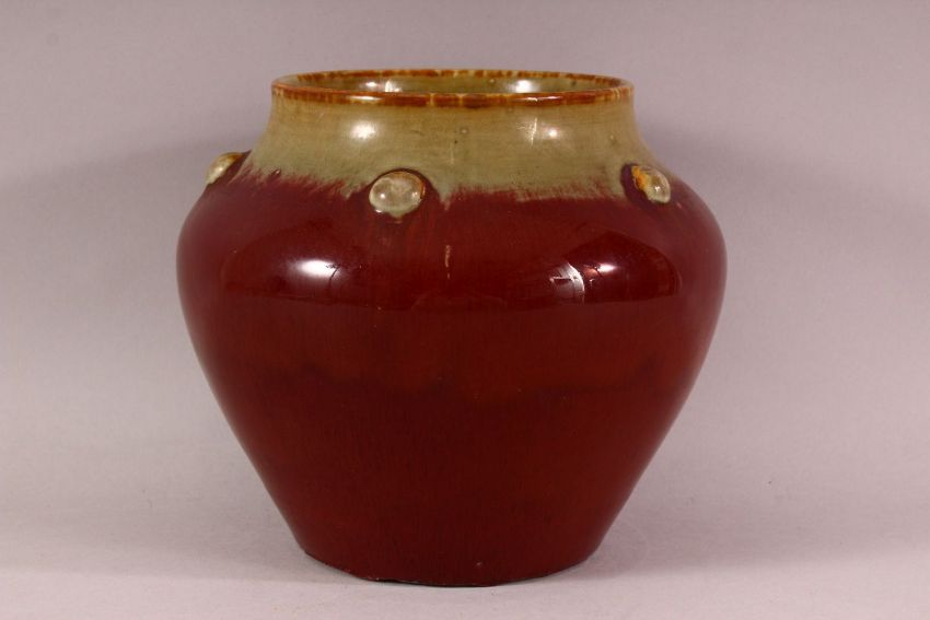 A CHINESE FLAMBE PORCELAIN JAR / VASE - with a graduating flambe glaze with raised stud boss decoration, 19cm high.