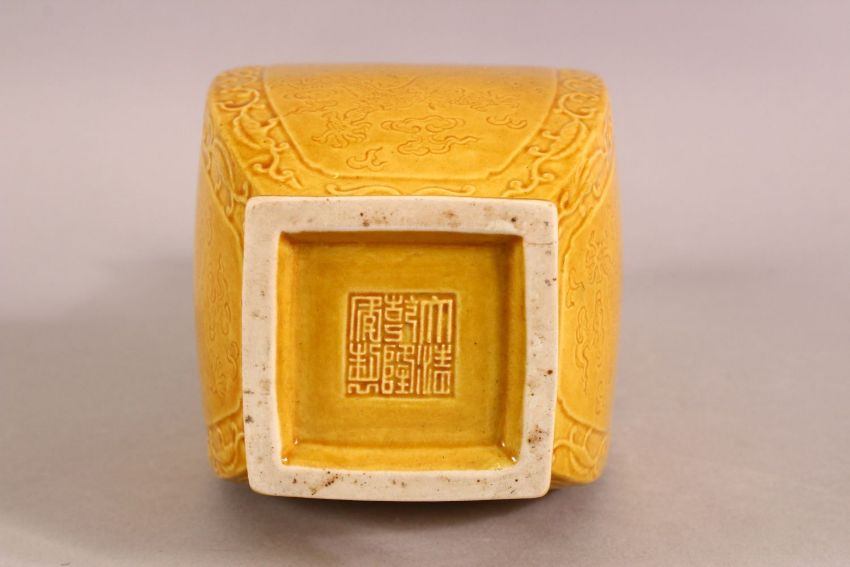 A SMALL CHINESE YELLOW GROUND SQUARE FORM VASE, with relief decoration of bats and stylised flora, the body with panels depicting dragons, six character mark to the base, 22cm high.