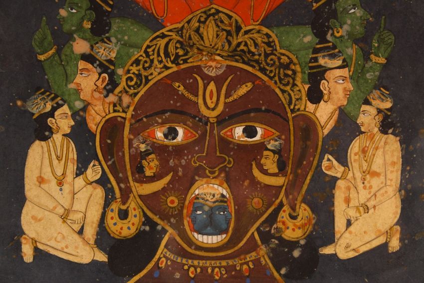 A FINE 19TH CENTURY INDIAN PAINTING DEPICTING HINDU DEITIES, framed and glazed, 41cm x 31cm.