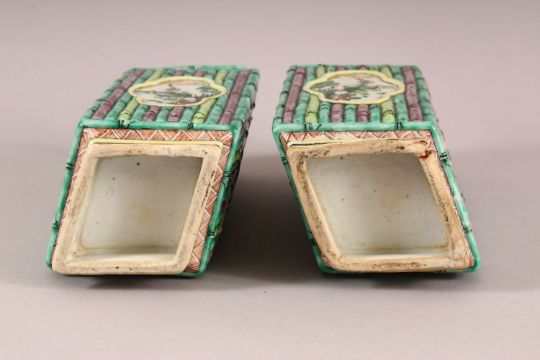 A PAIR OF 19TH / 20TH CENTURY FAMILLE VERTE PORCELAIN DIAMOND SHAPED VASES, with ribbed bamboo style body with painted panels of boys in landscapes, 25cm high