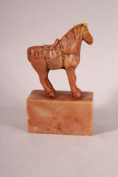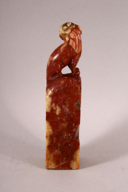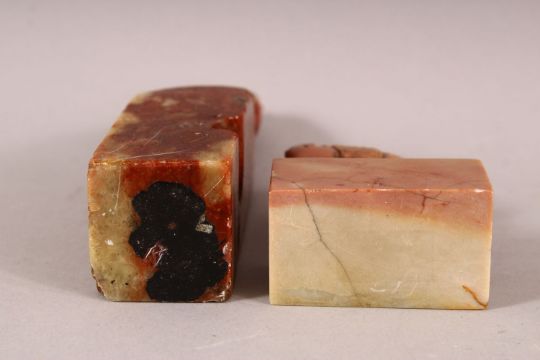 TWO CHINESE CARVED SOAPSTONE SEALS, one carved with lion dog, the other with a horse, 13.5cm and 8cm high.