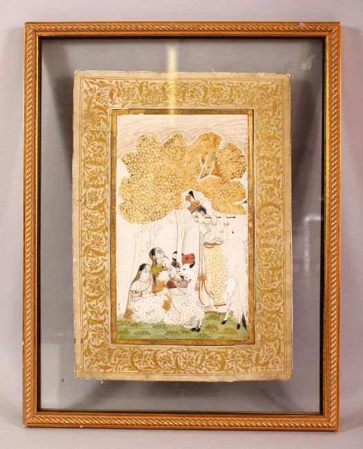 A FINE 19TH CENTURY INDIAN MINATURE PAINTING OF KRISHNA WITH HIS GOPIES, framed and glazed in a glass surround, overall 37cm x 29cm.
