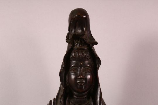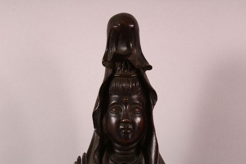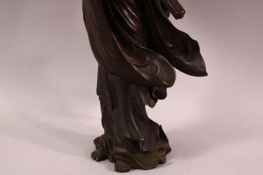 A CHINESE BRONZE FIGURE OF GUANYIN holding a scroll, her other hand raised in a mindfulness gesture, 48cm high.