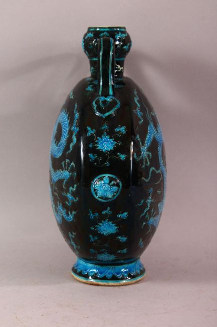 A MING STYLE FAHUA DECORATED PORCELAIN DRAGON MOONLASK, the body decoroated in turquoise with a dragon, with twin handles, 27cm