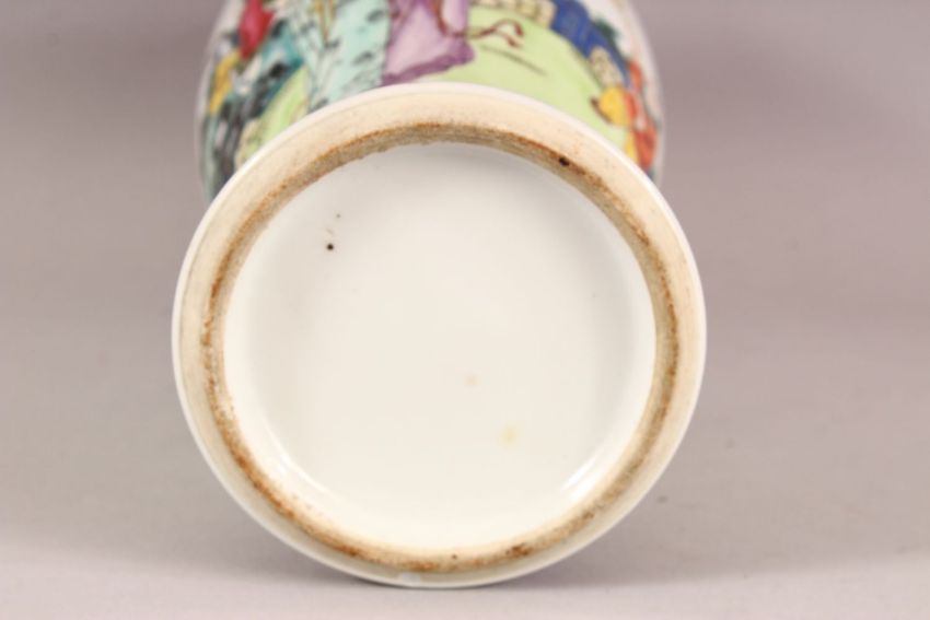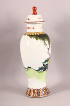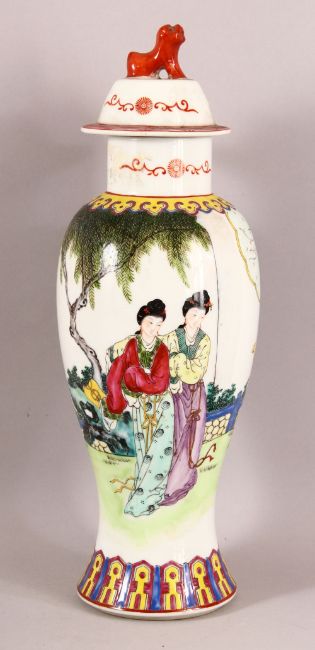 A CHINESE FAMILLE ROSE PORCELAIN VASE & COVER - decorated with scenes of figure sin garden settings, 39cm