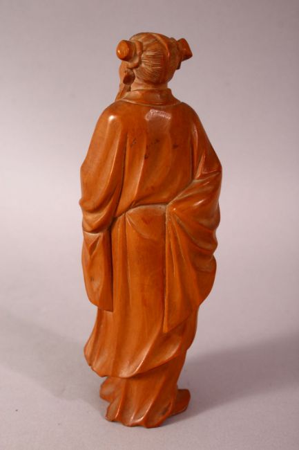 A CHINESE CARVED HARD WOOD FIGURE OF AN IMMORTAL - the figure in traditional gowns with his front section revealed, 16cm