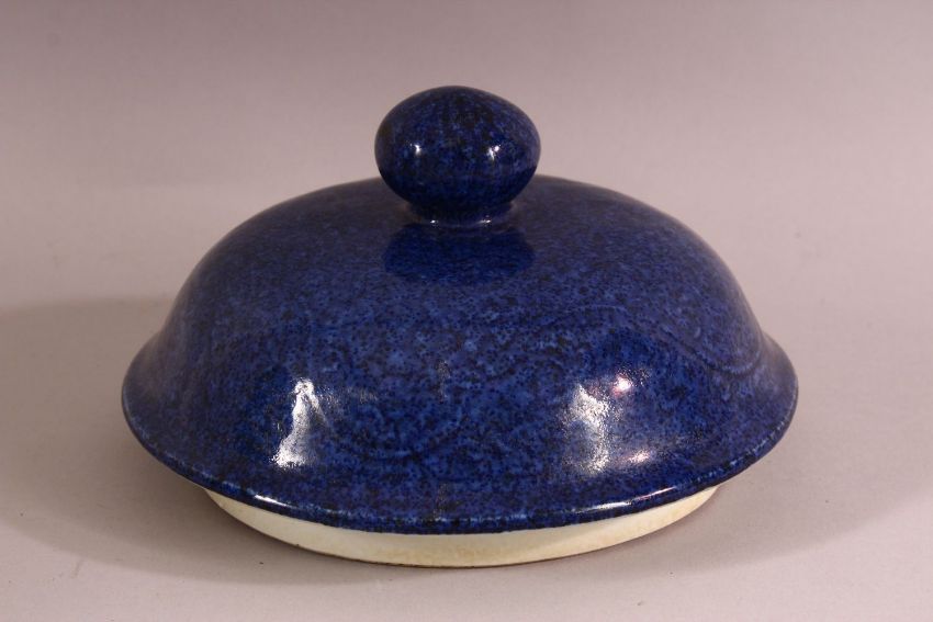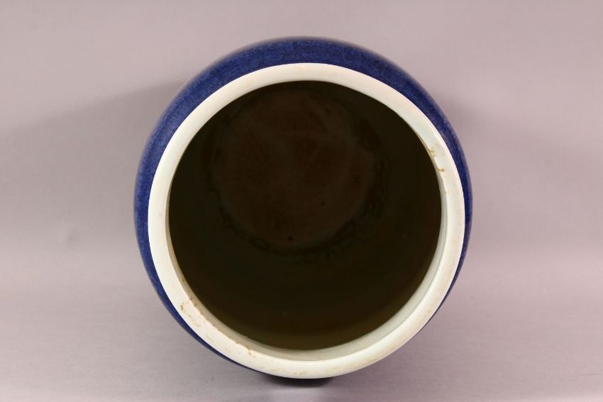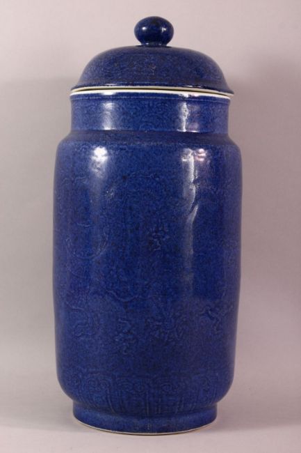 A LARGE CHINESE POWDER BLUE PORCELAIN JAR & COVER - with incised body decoration of a dragon, 47cm high.