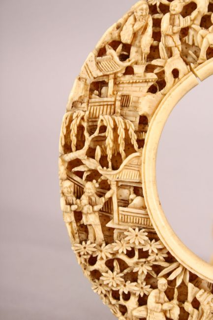 A 19TH CENTURY CHINESE CANTON CARVED IVORY OVAL FRAME, the frame finely carved with figures carrying out various pursuits between buildings, 11cm x 10.5cm.