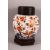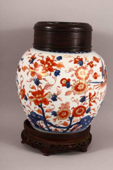 A 18TH / 19TH CENTURY CHINESE IMARI PORCELAIN GINGER JAR & WOOD COVER - decorated in typical imari palate depicting flora, with a carved wooden stand and cover, 32cm high overall.