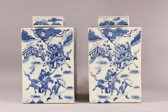 A LARGE PAIR OF CHINESE BLUE & WHITE SQUARE FORMED CADDY & COVERS, each decorated with scenes off figures upon horseback, mid battle in landscapes, the bases each with six character marks, 31cm high x 18cm square.
